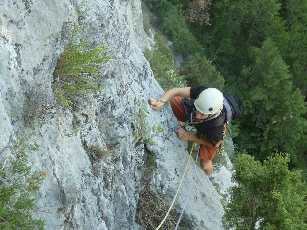 El Guillem decideix fer la primera tirada i sense pensar-ho enfila placa amunt. La via comença amb una placa fina de cinquè per superar un díedre i sortir a un tram herbós, després cal superar un tram vertical i arribar a una reunió, com que les cordes li tiben molt, fa reunió en un replà on hi ha dues assegurances, (antiga reunió) jo el segueixo i pujo directament fins la següent reunió que faig a la dreta del bloc característic de la via, hi ha la reunió a l’esquerra del bloc, però les cordes tiben molt.