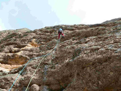 La vuitena tirada , molt vertical i d’anar sortejant panxetes ens deixa a peus de la cornisa d’escapament, el tram final de la tirada cal anar amb cura per la roca.