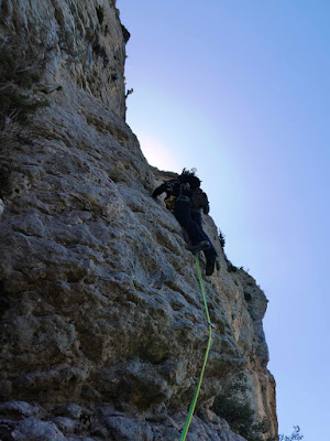 La tercera tirada, comença amb un tram vertical amb roca arrodonida, d’entrada no es veu la primera assegurança i sembla que calgui apretar per arribar a la segona, però una vegada situat a la paret , la primera esta molt propera.
