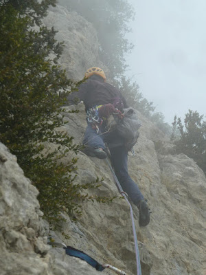 Aquí fem el canvi de cordes i agafa la cordada el Josep, una tercera tirada amb uns pocs metres interessants, la resta un rostoll de terra i fang que amb les pluges d’aquesta nit sembla una pista de patinatge. La reunió és dalt de la carena amb una instal·lació preparada per a fer un rapel de 27 metres per anar a cercar el següent sistema de contraforts.